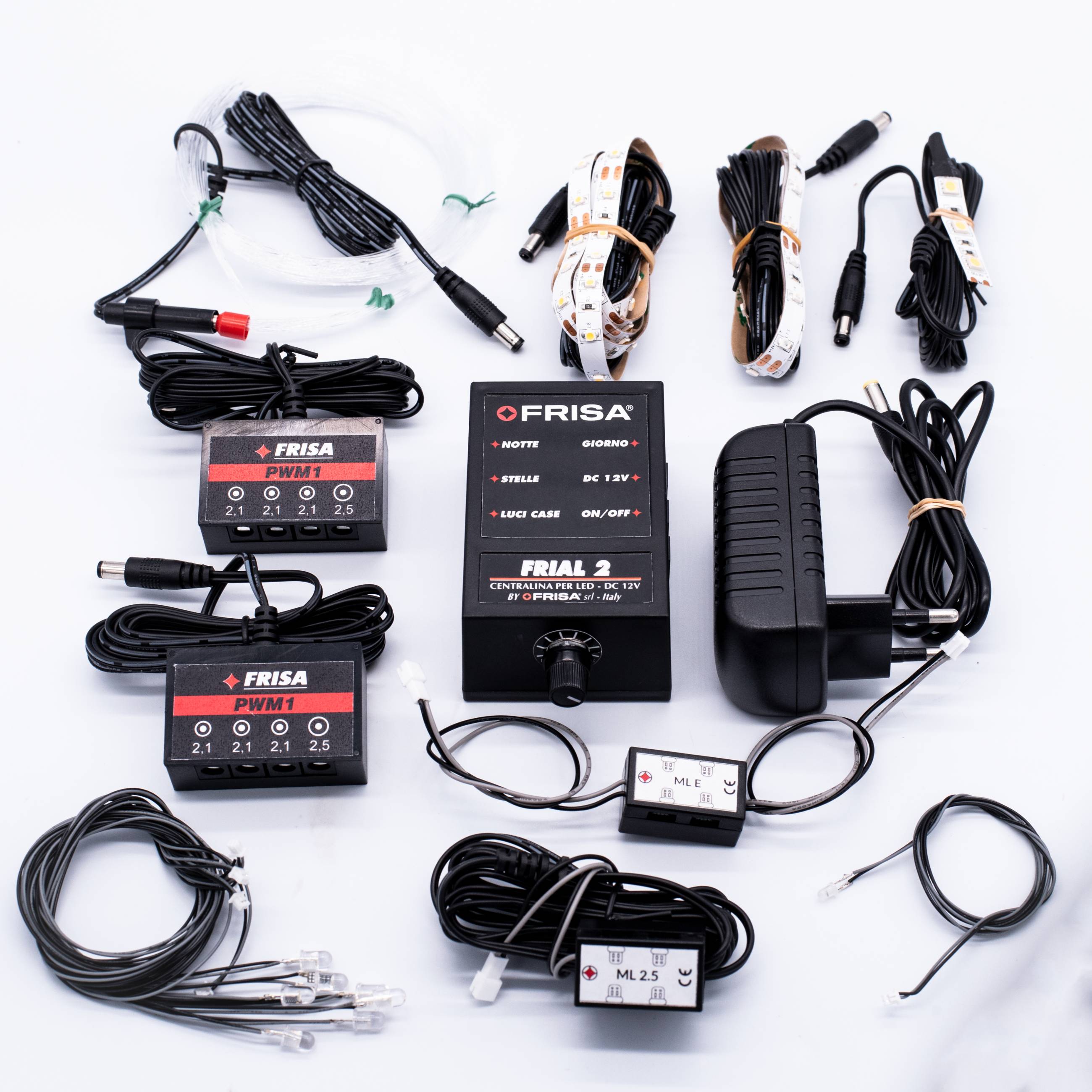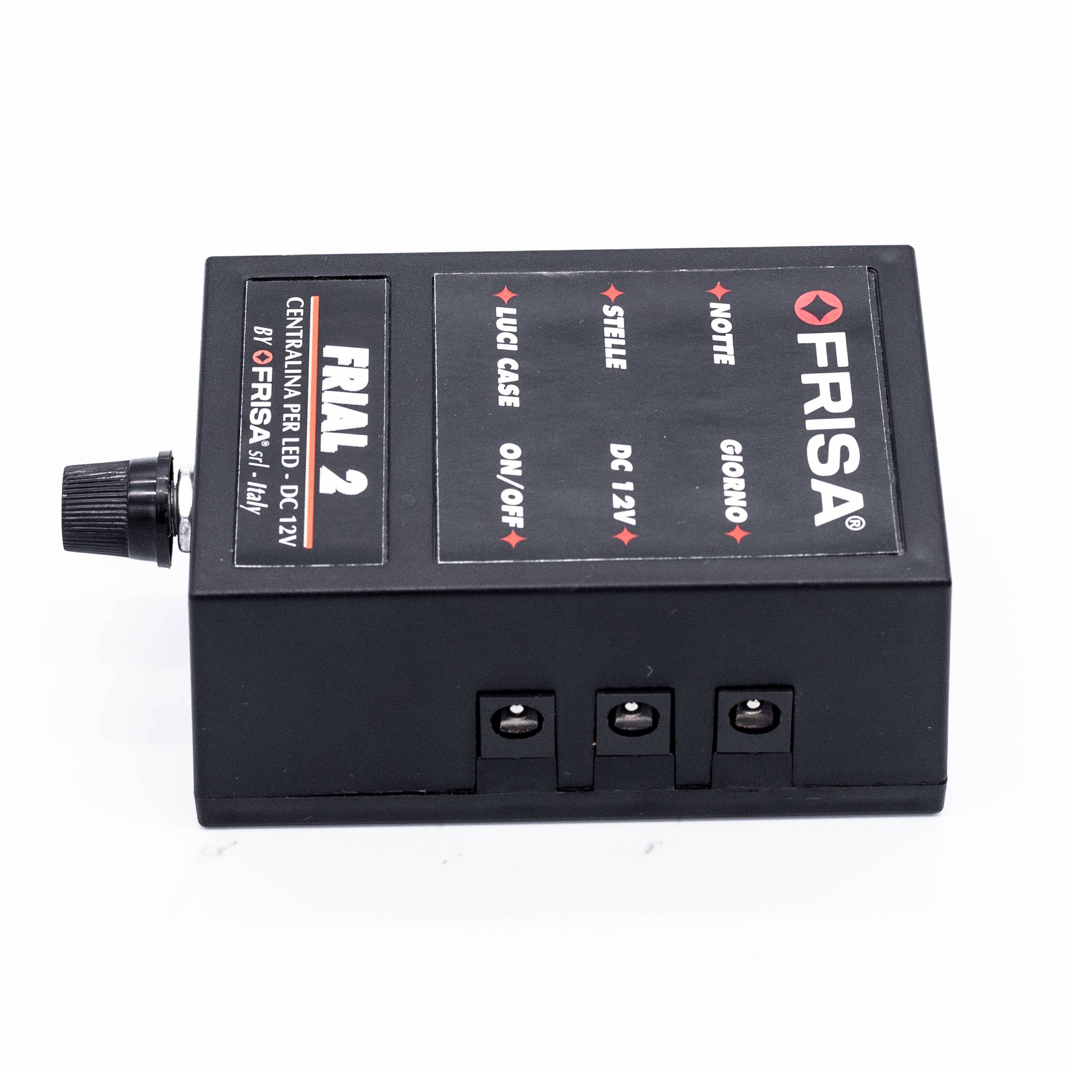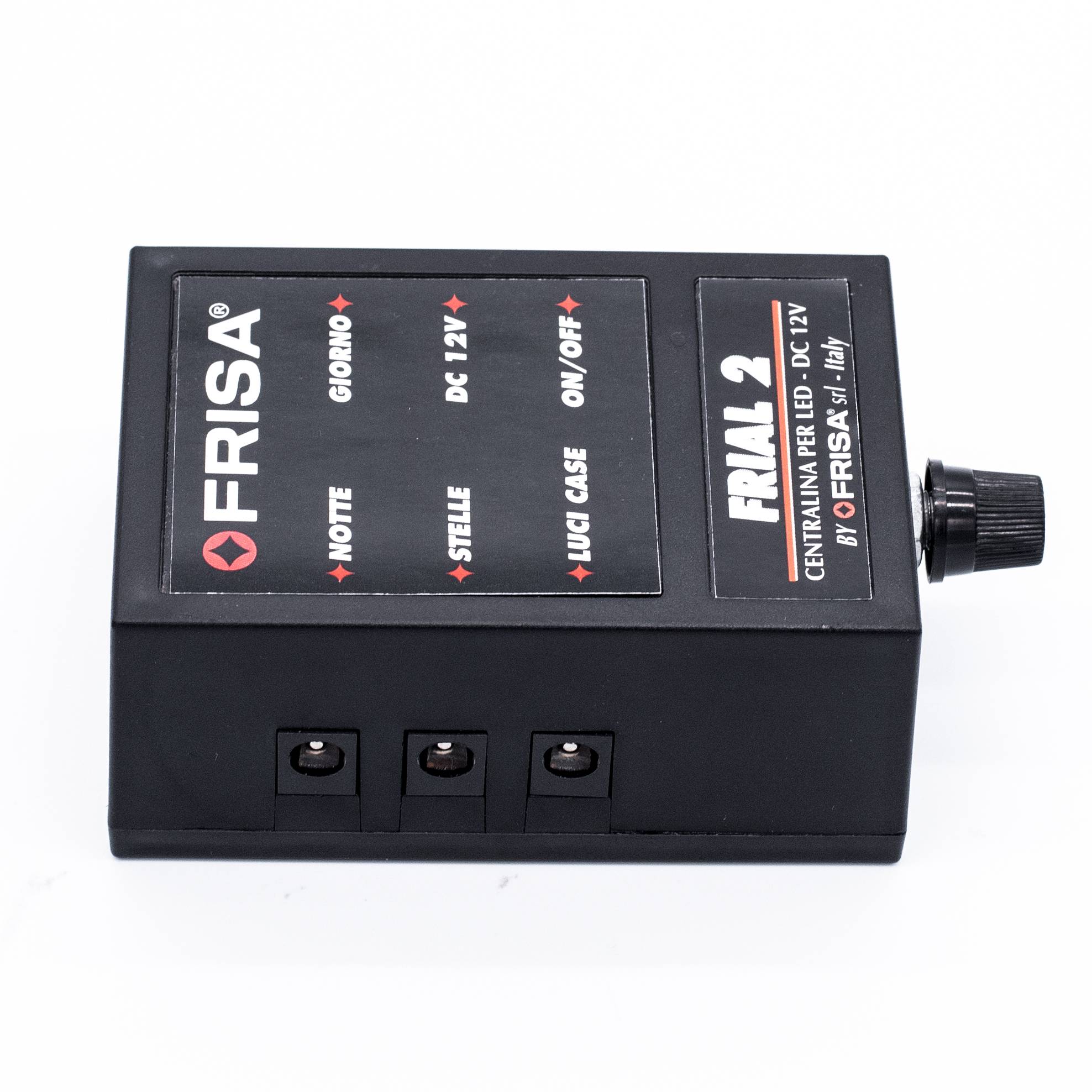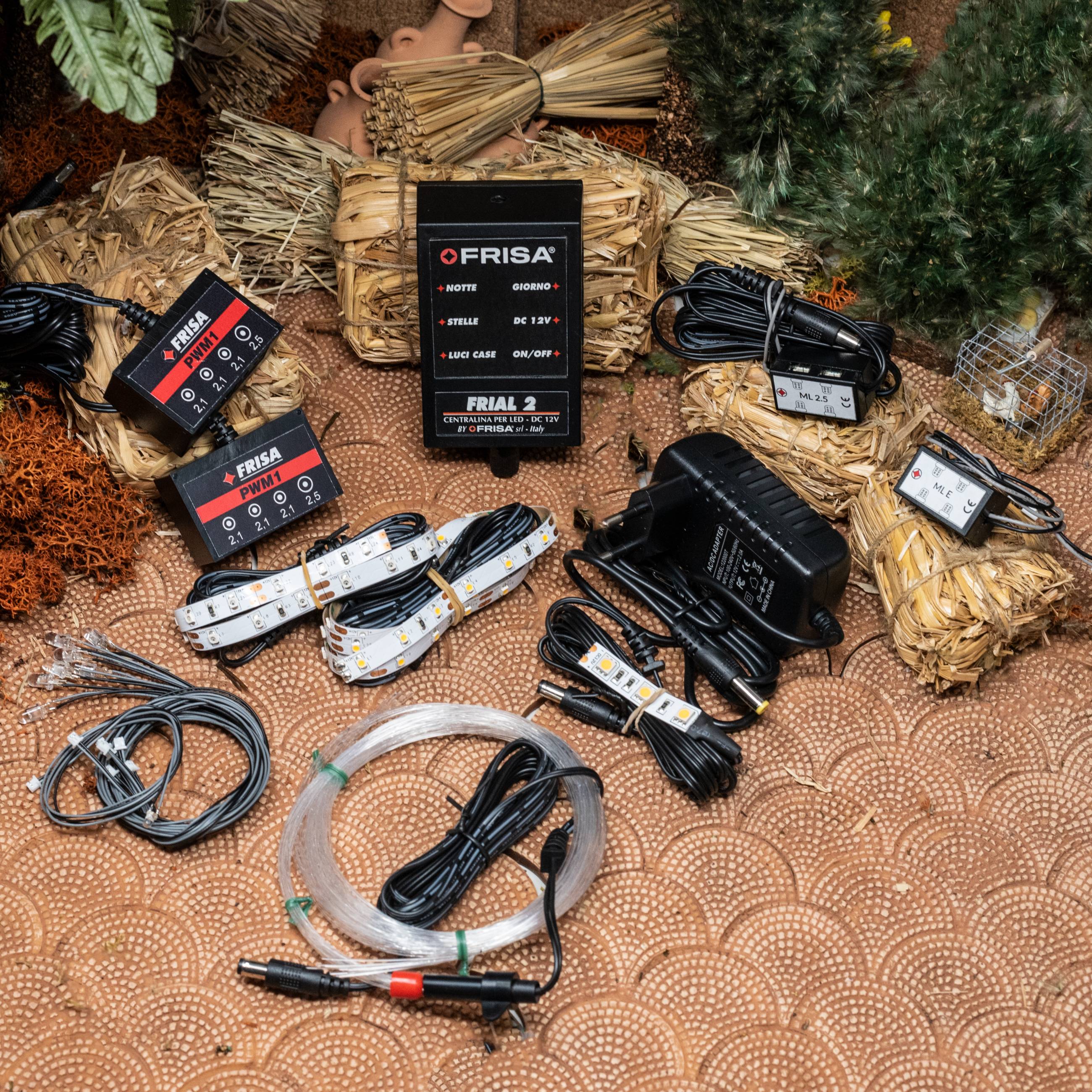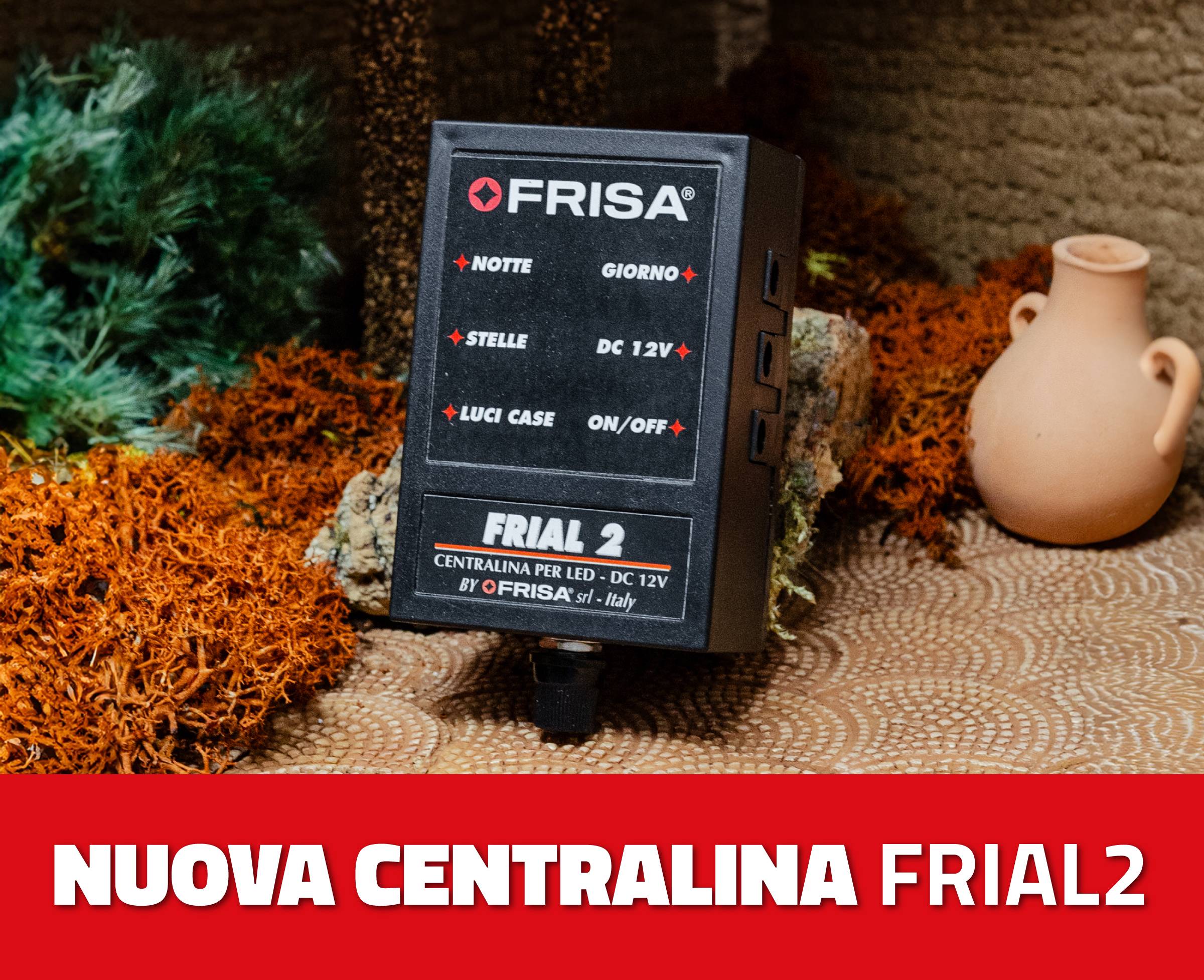 FriaL 2 representa un magnífico instrumento para la ilumación led y la alimentación de efectos sincronizados en Belenes de tamaño mediano. Más allá de los dos fundidos dispone de una toma sincronizada on/off para cada fase, útil para alimentar luces led o efectos en sincronía con el día y la noche. Dispone además de una toma "estrellas" con parpadeo y de una toma fija útil para fase azul fija o para cualquier otro accesorio que tenga que permanecer encendido durante el ciclo.